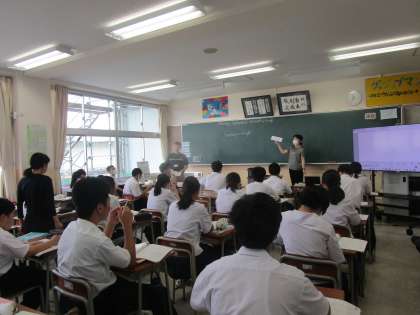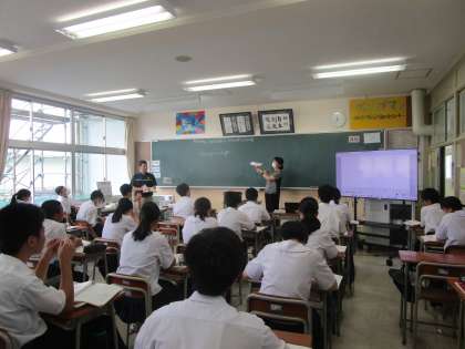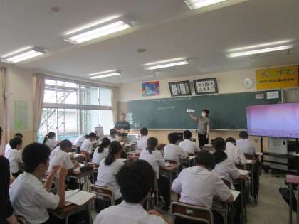 9月11日(月)4限 2年4組の英語の授業は、新しい単語の発音をALTの先生を交えて練習していました。