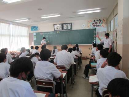 1年3組 数学 公開日 2023/09/13 更新日 2023/09/13 1学年 9月13日(水)4限 1年3組の数学は、「比の考えを利用して、問題を解決しよう」という課題で学習していました。生徒が前に出て説明し、みんなが聞いて質問したりして理解を深めていました。
