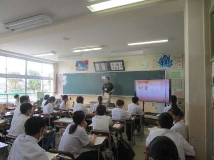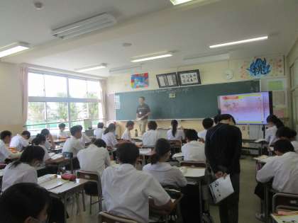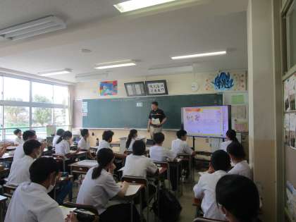 2年1組 英語 公開日 2023/09/14 更新日 2023/09/14 2学年 9月14日(木)1限 2年1組の英語は、ALTの先生が「将来の自分自身へのメッセージ」という課題で学習していました。表情豊かにジェスチャーも入れながら生徒と積極的にコミュニケーションしていました。先生2人が個別にアドバイスして理解を深めていました。