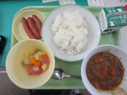 本日の給食はカレーライスでした。明日の富山市新人大会に向けて元気の出るメニューでした。