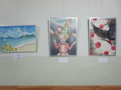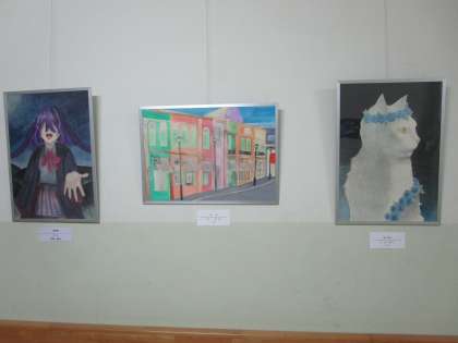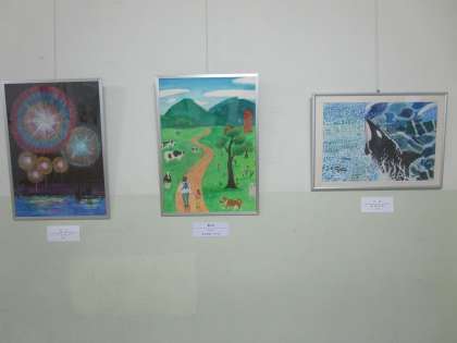 美術室前の廊下に夏休み頑張った美術部の作品が展示されました。