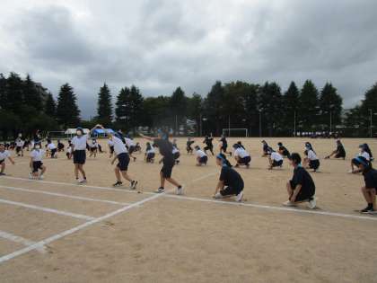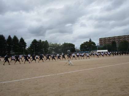 青龍団がグラウンド中央で横1列の雄大な並びで隊形を確認しながら演技していました。