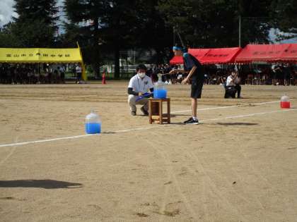 先輩、後輩一緒に大きなペットボトルにひしゃくで水を運び、あふれるまで頑張っています。