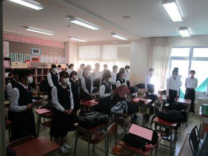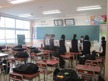 3年2組が教室や廊下で練習していました。廊下で生徒と担任の先生が曲に合わせて身体を揺らして歌っていました。