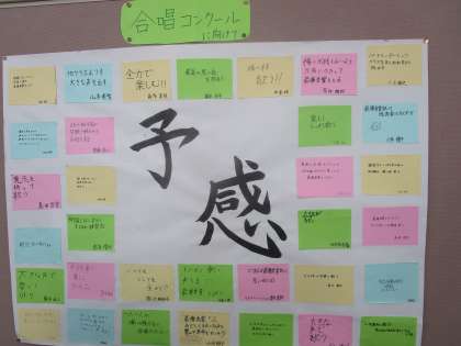 3年4組の教室の掲示板に合唱コンクールに向けての各自の目標が貼られ、掲示されていました。