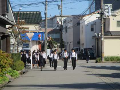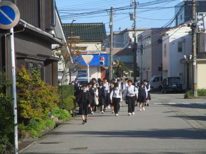 朝晩寒くなってきましたが、さわやかな秋晴れが続き、気持ちがいいです。寒くなったせいか、遅刻が少し増えてきています。慌てて学校へ来ると安全面も心配です。早めに登校できるよう準備、声かけお願いします。写真は校門から奥田中学校前の登校の様子です。