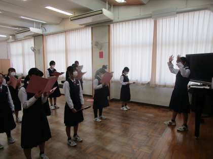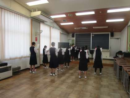 3年5組 合唱練習の様子 公開日 2023/10/13 更新日 2023/10/13 3学年 10月13日(金)放課後 第2音楽室で3年5組の女子が合唱練習していました。指揮、伴奏に合わせて細部まで練習していました。