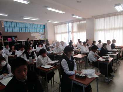2年3組の美術は、「仮面は語っているか」という課題で作成した仮面に自分の気持ちが色中模様で表現できているか、そしてみんなにも見てもらい意見をもらいました。