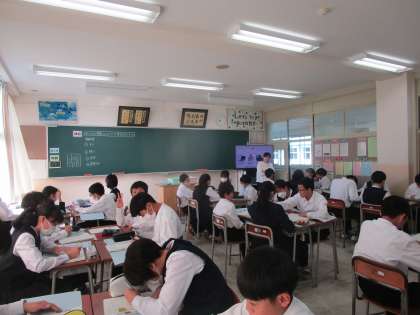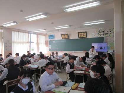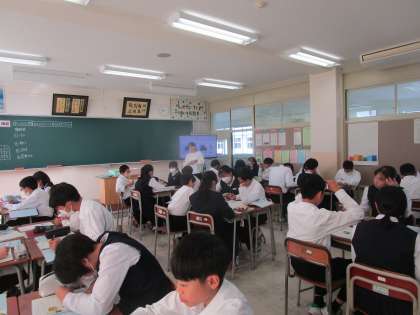 1年5組の理科は、「水に溶けた物質はどのように取り出せるだろうか」という課題で学習していました。グループで意見交換して学習を深めていました。