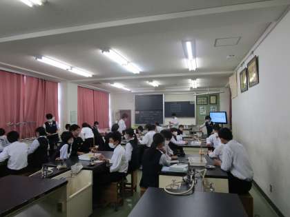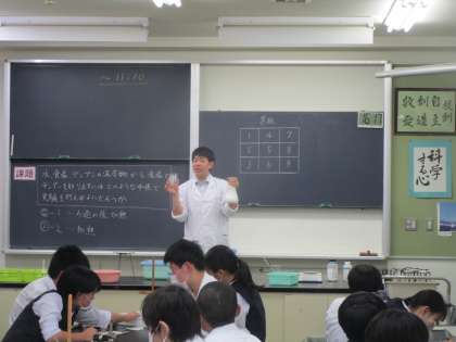 1年4組の理科は、理科室で「水、食塩、デンプンの混合物から食塩とデンプンを取り出すにはどのような手順で実験を行えばよいだろうか」という課題で学習していました。実験をして確かめていました。