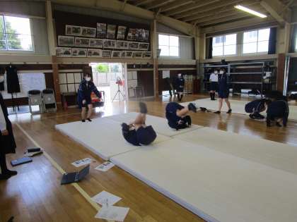 3年5組、6組女子保健体育 公開日 2023/10/16 更新日 2023/10/16 3学年 10月16日(月)4限 3年5組、6組女子の保健体育は、武道館でマット運動を学習していました。グループで音楽に合わせて集団演技を作っていました。
