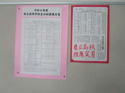 県立高校の推薦募集が発表されました 公開日 2023/10/18 更新日 2023/10/18 3学年 テレビ、新聞等でも見たかと思いますが、3年生の廊下の学年掲示板に県立高校の推薦募集の記事が掲示されました。自分の合った進路選択を考えていきましょう。もちろん学力アップを。