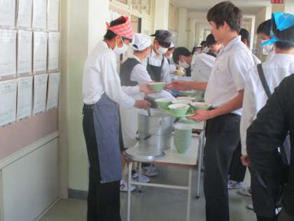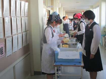 新しい配膳台で給食を準備しました