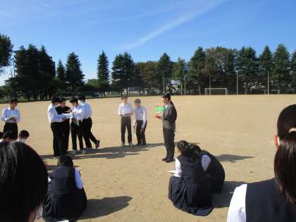 2年2組の理科は、天気について学習していました。乾湿計や風向風速計を生徒に見せて説明した後、グラウンドに出て、気温や湿度、風向き、風量など測定していました。ちょうど風もあり、よく分かりました。