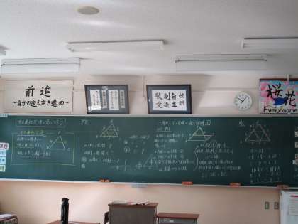 3年生の教室の黒板に授業で学習した中点連結定理の板書が残っていました。みんな大丈夫かな