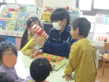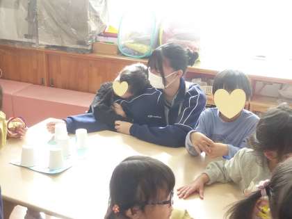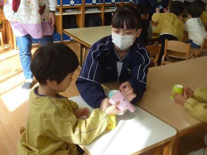 3年2組奥田保育園訪問 その1 公開日 2023/10/24 更新日 2023/10/24 3学年 10月23日(月)10:00 本日、技術・家庭科の保育園訪問を4年ぶりに実施しました。 まずはじめに夏休み中に製作したおもちゃを紹介した後、互いに楽しく触れ合いました。