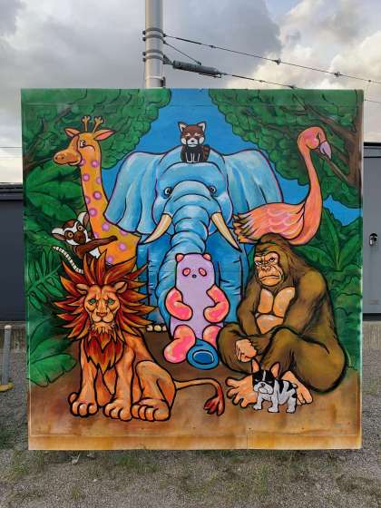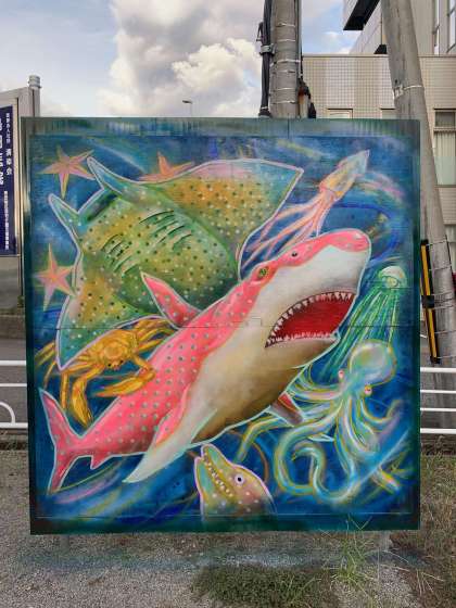 それぞれテーマがあり、1年生の担当した壁画は「水族館」、3年生がデザインして2年生が担当した「動物園」、そして1年と2年が力を合わせて制作途中の壁画「16匹の子犬」となっており、それぞれバラエティに富んだ作品になってます。