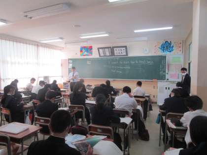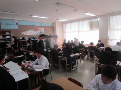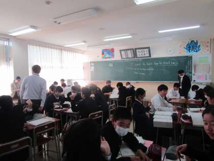 2年1組 英語 公開日 2023/10/27 更新日 2023/10/27 2学年 10月27日(金)1限 2年1組の英語は、3人の先生で授業が進められていました。ALTの先生が英文を読んだ後、繰り返し発音していました。グループになって「〜したい」の用法をプリントに記入し、友達に伝えていました。