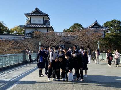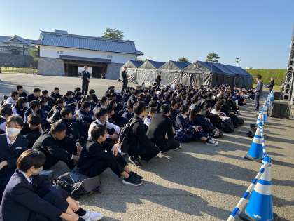班別活動を終え、全ての班が集合時間前に集まりました。秋晴れの下、歩き回って少し疲れた生徒もいるようです…。