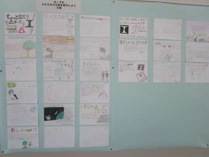 1年生の国語で学習した「ポップ おすすめの文章を紹介しよう」が廊下に掲示されました。