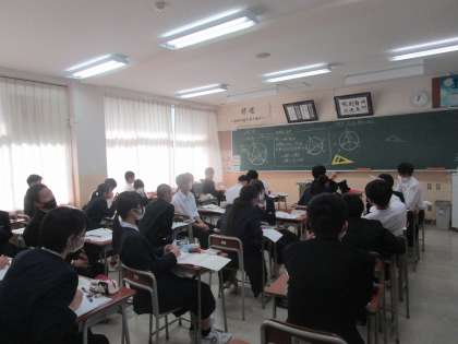 3年5組 数学 公開日 2023/11/08 更新日 2023/11/08 3学年 11月8日(水)4限 3年5組の数学は、「円周角について考えよう」という課題で学習していました。近くの生徒と既習事項について確認しながら学習が進められていました。
