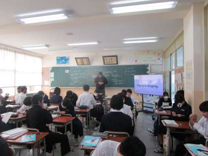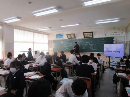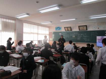 1年1組 英語 公開日 2023/11/16 更新日 2023/11/16 1学年 11月16日(木)4限 1年1組の英語は、今していることをペアの生徒にジェスチャーで伝える学習をしていました。楽しみながら学習を深めていました。