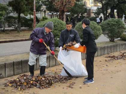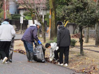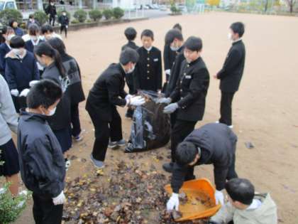 ボランティア活動 落ち葉拾い 公開日 2023/12/01 更新日 2023/12/01 学校だより 今朝、久しぶりの晴れとなりました。生徒玄関から正門にかけて、落ち葉拾いのボランティア活動が行われ、1年4組、2年4組の生徒たちが参加し、用務員さんと一緒に活動しました。大型のゴミ袋10袋以上の落ち葉が回収されました。