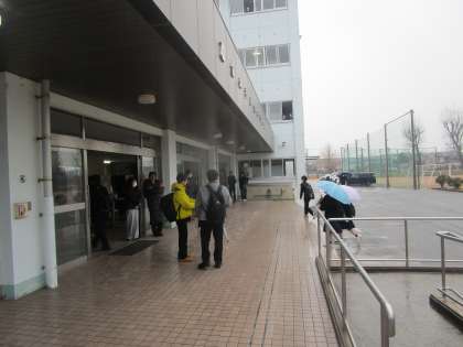 今日は雨で傘、防寒具を着ての登校となりました。保健の先生が玄関先に立ち、生徒への声かけ、表情や顔色など見ていただいています。登校時、保健の先生とほっとして話をしている様子があります。生徒玄関にも校長先生をはじめ、担任以外の先生が立ち、挨拶を交わしています。