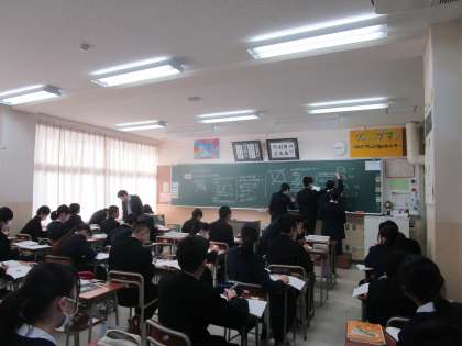 2年4組の数学は、「平行四辺形になるための条件」という課題で学習していました。生徒が黒板に解答を書いていました。友達に教えている生徒もいました。