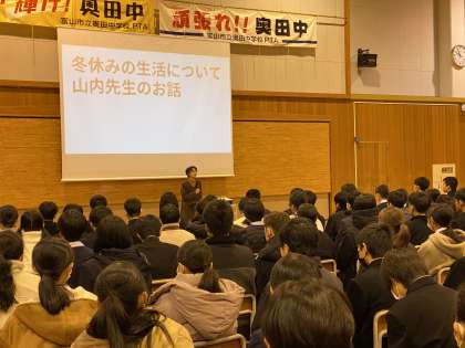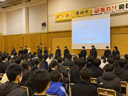 12月21日(木) 2学期末学年集会 公開日 2023/12/22 更新日 2023/12/22 2学年 冬休みを前に学年集会を行いました。学級MVPの表彰、冬休みの過ごし方、学年主任からの話等がありました。また、学年生徒会からの2学期の振り返りでは、あいさつへの取り組みや3学期に向けての改善点をクラスの仲間に向けて伝えました。