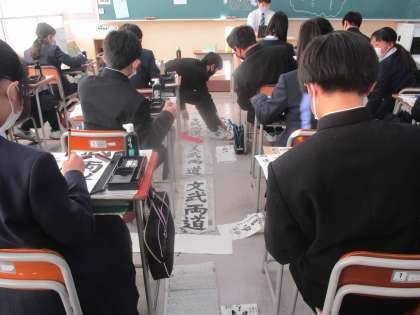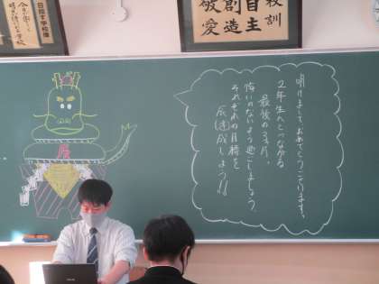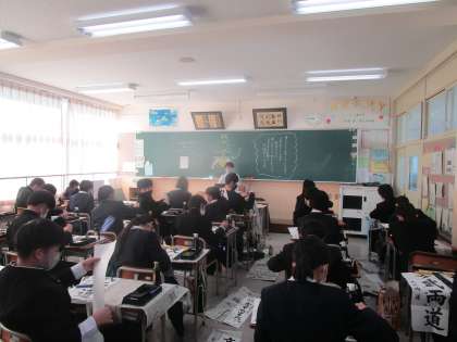1年生の書き初め大会の様子です。黒板には3学期の担任の先生の言葉が書かれていました。