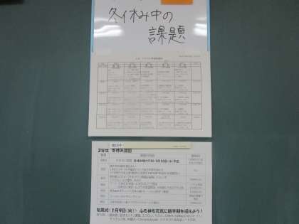冬休みの宿題やテキストノートの返却がされていました。明日の確認テストも頑張れ。
