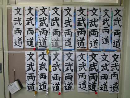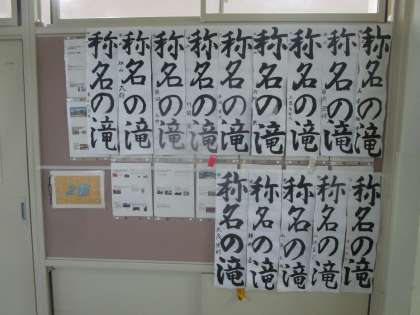 書き初め大会、金、銀、銅 公開日 2024/01/10 更新日 2024/01/10 学校だより 昨日の書き初め大会の優秀作品に金、銀、銅の札が貼られました。登校して生徒が生徒の作品を鑑賞していました。