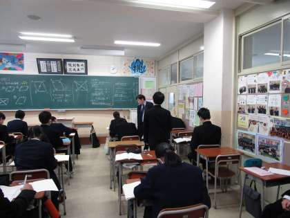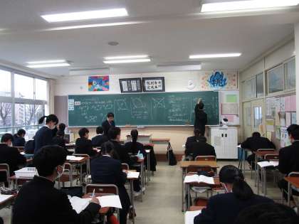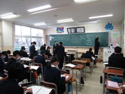 2年1組 数学 公開日 2024/01/10 更新日 2024/01/10 2学年 1月10日(水)5限 2年1組の数学は、「平行四辺形になるための条件」を学習していました。問題を黒板で解く生徒、先生に解答を見せて合格をもらう生徒、友達同士で教え合う生徒、黙々とノートに問題を解いている生徒がいました。