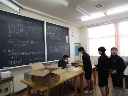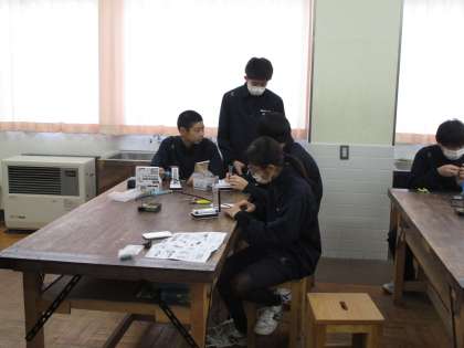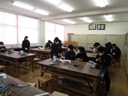 2年2組 技術 公開日 2024/01/16 更新日 2024/01/16 2学年 1月16日(火)1限 2年2組の技術は、LEDの制作をしていました。はんだづけの学習をしていました。先生に作品をチェックしてもらっています。