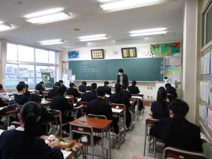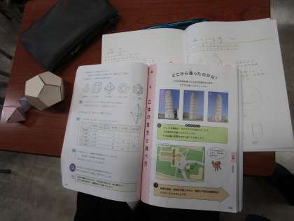 1年4組 数学 公開日 2024/01/18 更新日 2024/01/18 1学年 1月17日(木)1限 1年4組の数学は、「正多面体の特徴をつかもう」という課題で学習していました。厚紙で作った多面体も見ながら確認していました。