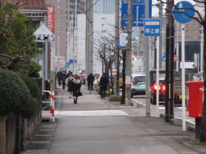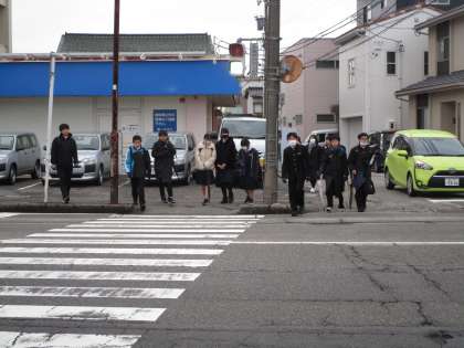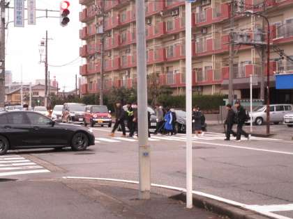 1月19日(金) 奥田中学校前の交差点での生徒の登校の様子です。
