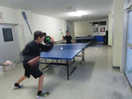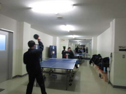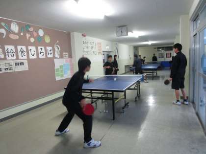人数の多い男子卓球部が、給食室前、相談室前に卓球台を出して練習に励んでいました。