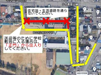 3 降雪、積雪の時期を迎え、車で送迎する機会も増える可能性がありますが、路肩に積雪がある場合は、車のすれ違いができなくなります。やむを得ず送迎される場合は、「正門」から学校敷地内に入るようお願いします。