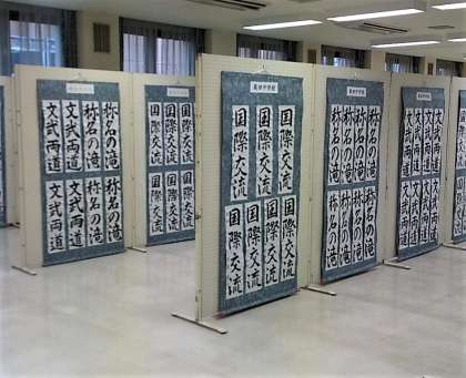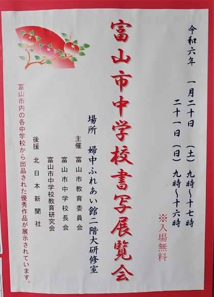 富山市中学校書写展覧会 公開日 2024/01/21 更新日 2024/01/21 学校だより 令和6年1月20日(土)21日(日)に、婦中ふれあい館大研修室で富山市中学校書写展覧会が行われています。奥田中学校からは、1〜3年生の金賞受賞者の作品が展示されています。