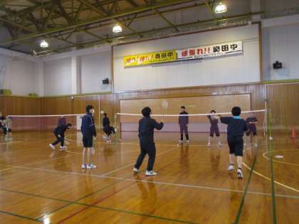 2年1組 保健体育 公開日 2024/01/23 更新日 2024/01/23 2学年 1月23日(火)1限 2年1組の保健体育は、体育館でバドミントンの学習をしていました。久しぶりの体育館で心地よくシャトルを打ち合っていました。