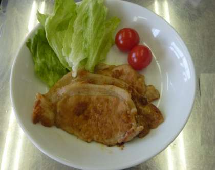 どの班も豚肉の筋切りに苦戦していましたが、この写真の班は2つとも筋切りが成功して、肉が反り返らずにまっすぐ平らに焼けました。