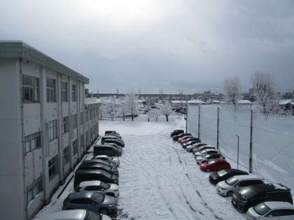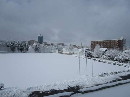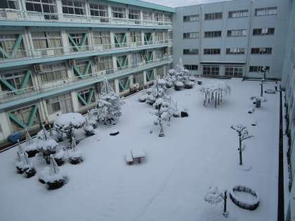 校庭も一面雪景色です。写真はグラウンド、ハンドコート、中庭の様子です。