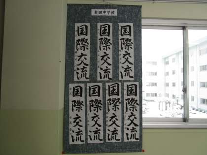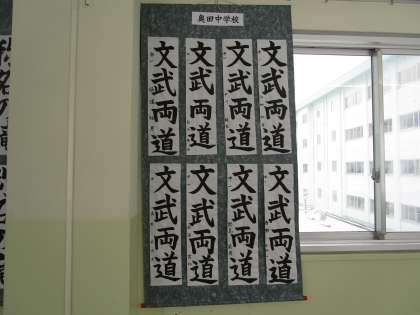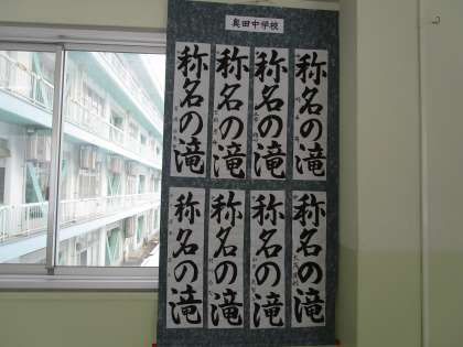 富山市中学校書写展覧会出品作品が校長室横の2階渡り廊下に展示されました。