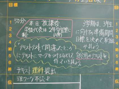 2年生学年黒板より 公開日 2024/01/25 更新日 2024/01/25 2学年 校長室横の学年黒板に学年主任さんのメッセージが書かれていました。2年生はテキスト学習で復習をし、学力アップを図っていました。
