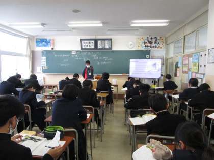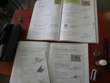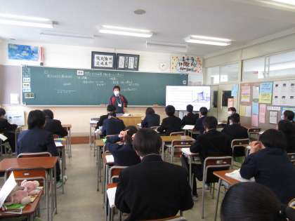 1月24日(水)5限 1年3組の数学は、「空間における直線、平面の角について考えよう」という課題で学習していました。