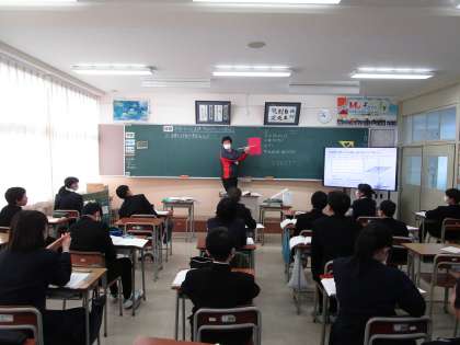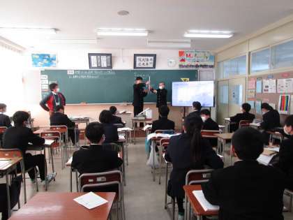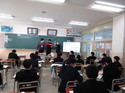 1年2組 数学 公開日 2024/01/25 更新日 2024/01/25 1学年 1月25日(木)1限 1年2組の数学は、「空間における直線、平面の角について考えよう」という課題で学習していました。実物を使って2名の生徒が実演し、説明していました。