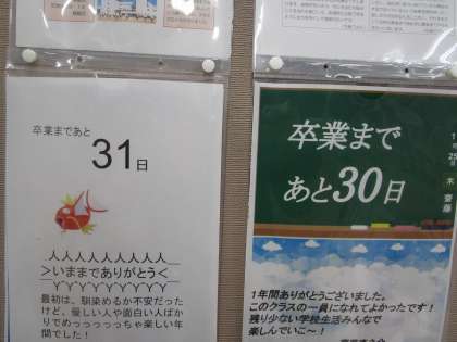 卒業カウントカレンダー 公開日 2024/01/26 更新日 2024/01/26 3学年 卒業までのカウントカレンダーが掲示されていました。一人一人が最終学年同じクラスの仲間への感謝が綴られていました。