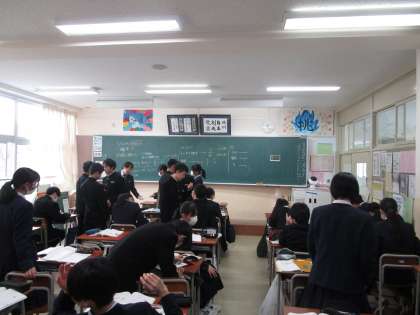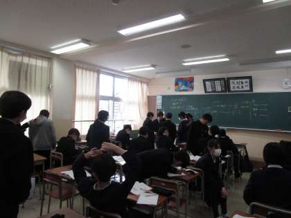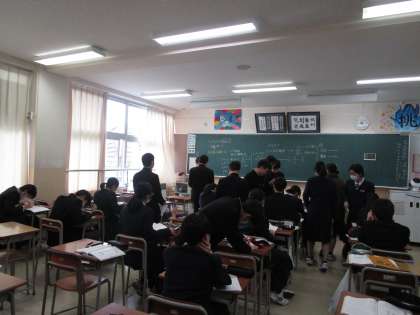 2年1組 数学 公開日 2024/01/31 更新日 2024/01/31 2学年 1月31日(水)5限 2年1組の数学は、確率について学習していました。先生にノートを点検してもらう生徒、生徒同士で教え合っている姿がありました。
