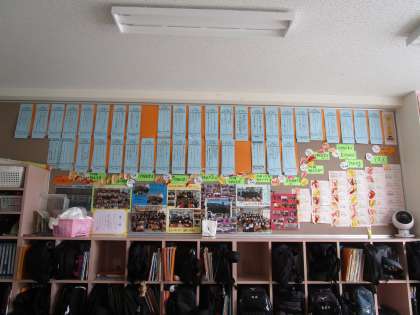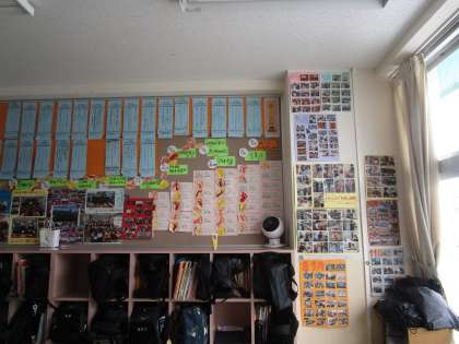 2年2組の教室掲示は1年間がいっぱいに掲示され、クラスの足跡が一目でわかります。